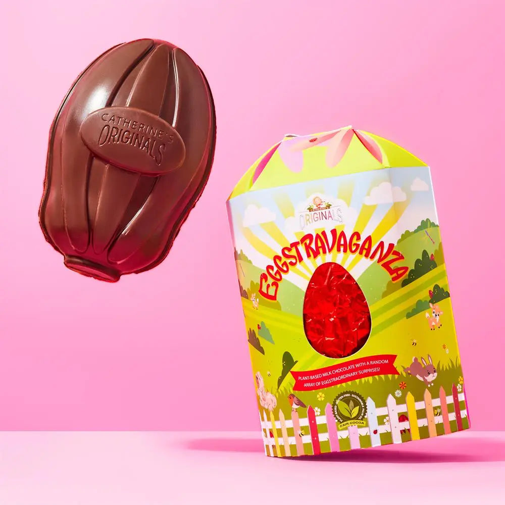 Offering a fun and unique experience unlike any vegan Easter Egg currently on the market. We are bold and big, truly 'eggstra'. Catherine's Originals Eggstravaganza - 270g Vegan, gluten free and ethically made with recyclable packaging and fairly traded cocoa.