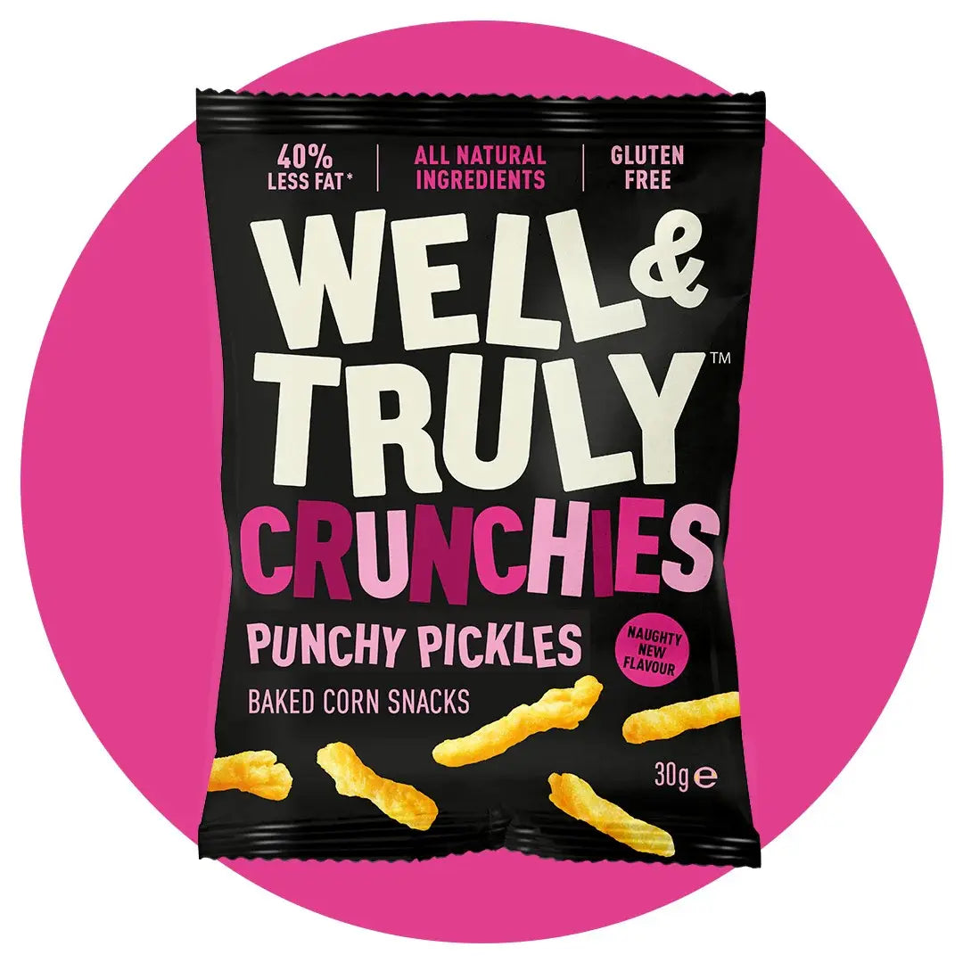 Baked corn sticks with a sharp, pickle-style seasoning, giving strong flavour in a lighter, gluten-free format that stands out in savoury ranges.