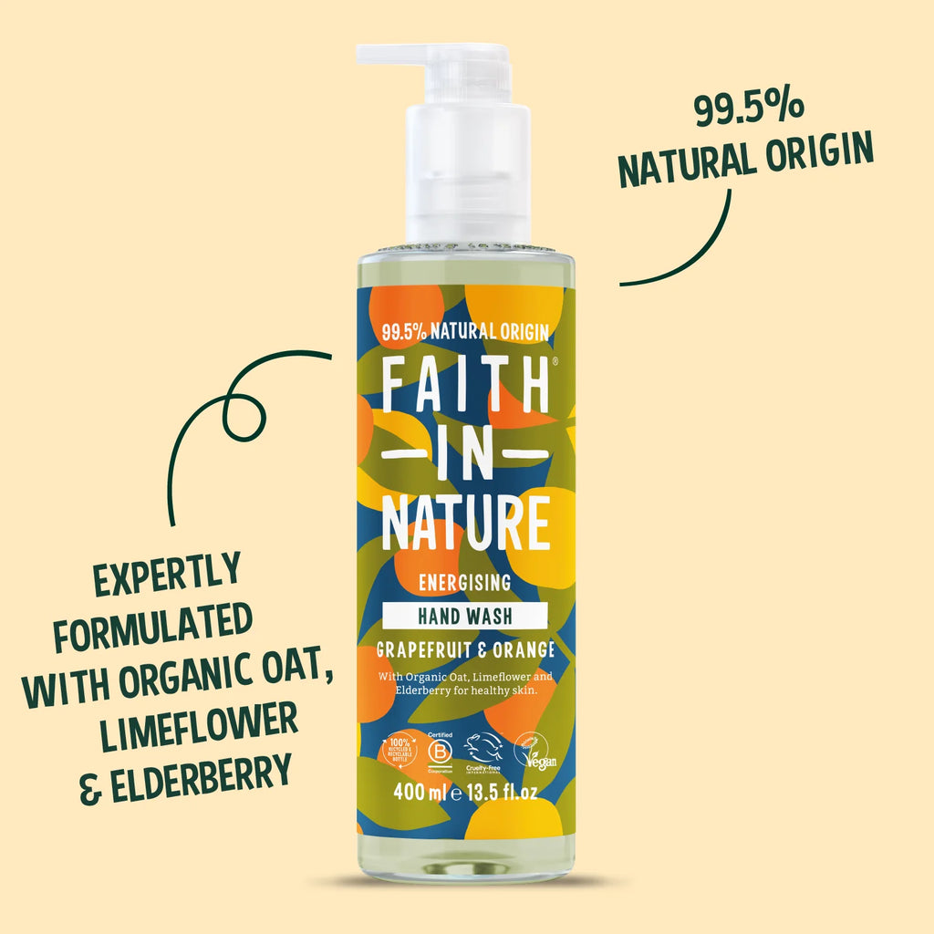 Faith In Nature’s energising Grapefruit & Orange Hand Wash is specially formulated and made in the UK with organic oat, lime flower and elderberry extracts, to help promote healthy skin as it gently and effectively cleans. Blended with grapefruit and organic orange essential oils, known to be energising, uplifting and mood-boosting. Dermatologically tested.